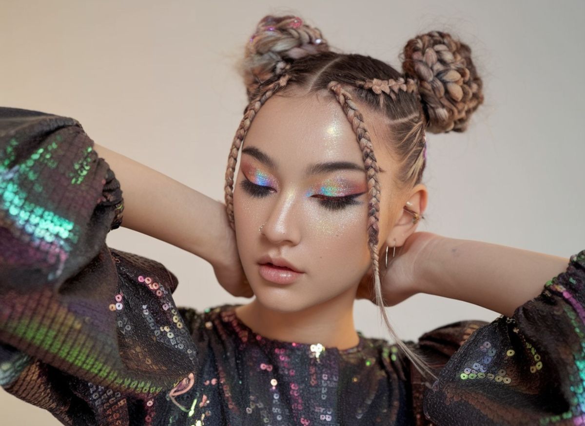 #1. Double Braided Space Buns with Glitter Roots
